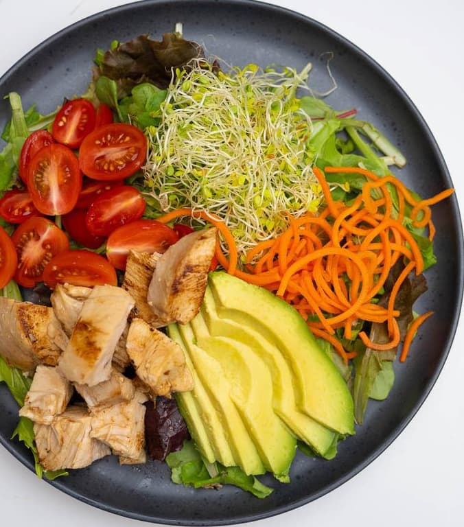 アボカド、半熟卵2個、クリームチーズ、ミックスグリーン、トマト、タマネギ、ディル、シーソルト&オリーブ
