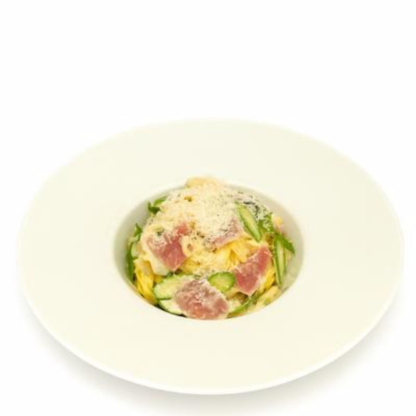 生タリアテッレ、パルマ産生ハム、アスパラガス、パルミジャーノ・レッジャーノのクリームソース
