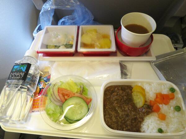 セントレアからのフライトですと夜食に近い食事になるかもしれませんが、ワインを飲みながらこれから始まるハワイ旅行のスタートとしては、とても良いと感じました。