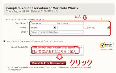 時間を選択して時間をクリックしますと、名前と電話番号とEメールアドレスを記入するサイトになりますので、全て記入したら「Complete Free Reservation」をクリックすれば良いのです。
