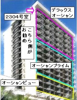 部屋からのワイキキビーチの眺望が一番良いのは2304の部屋です。