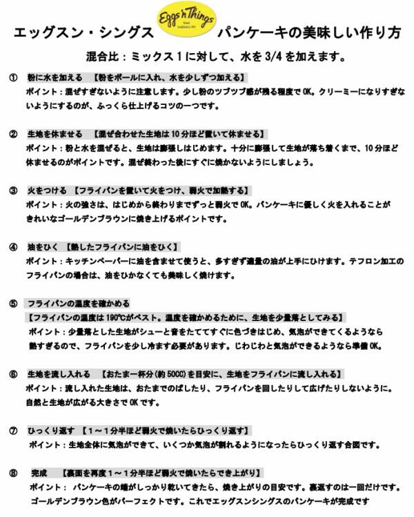 エッグスンシングスで購入したパンケーキ粉には日本語での作り方がありましたので、その通り作りました。