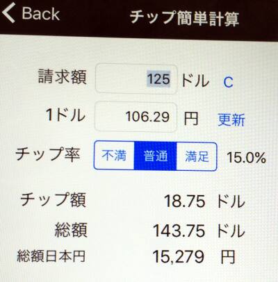 チップ計算はメニュー代金を入れてチップの%を選ぶだけで日本円を表示してくれます。