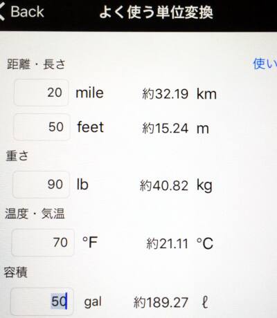 よく使う単位変換は調べたい単位のところに入力するだけです。
