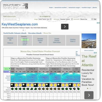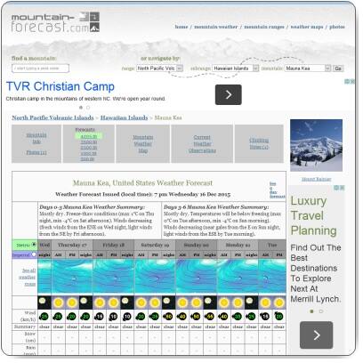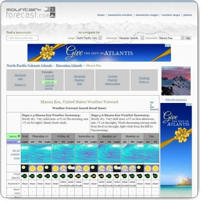 マウナケアの標高4,200メートルの山頂と、3,500メートル地点、2,500メートル地点の気温が表示されている天気予報がありますのでご紹介します。
