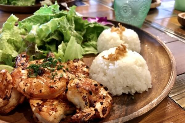 ニンニクソースが美味しいガーリックシュリンプはご飯との相性が抜群で、プレートランチとして人気があります。