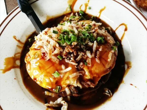ロコモコの基本はご飯の上にハンバーグと目玉焼きを乗せて、グレイビーソースをかけたものです。