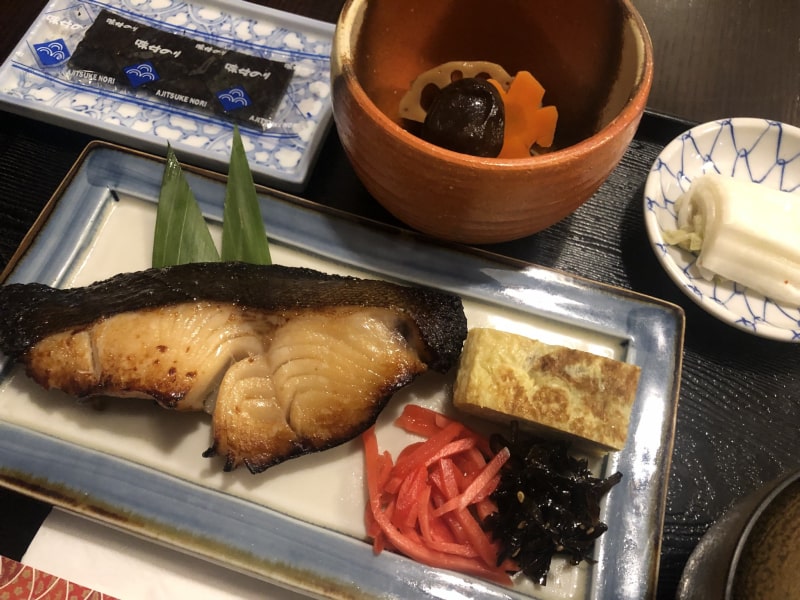 定食は小鉢、海苔、たまご(生卵または自家製だし巻き)、紫蘇昆布、ご飯、味噌汁、御新香、フレッシュフルーツが付いています。