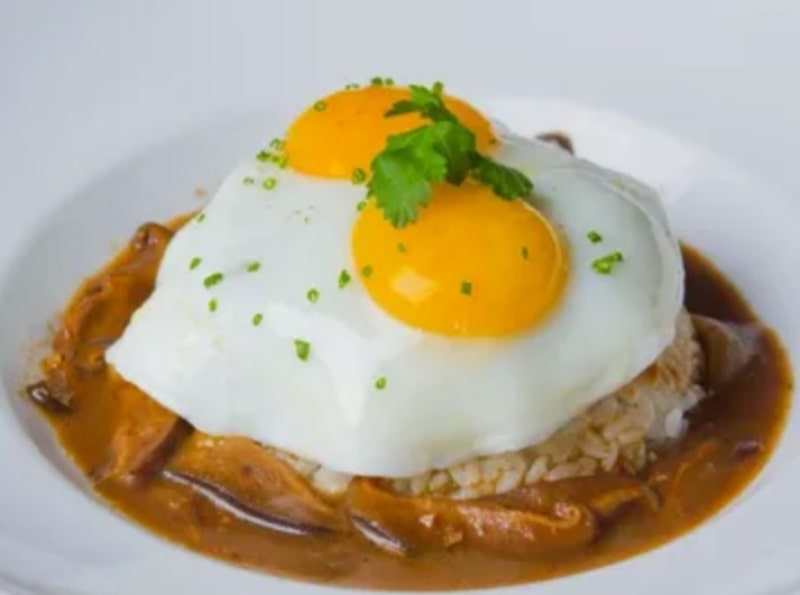 ライスアイス、バーガーパティ、卵のサニーサイド、マッシュルームのマルサラグレービーソース