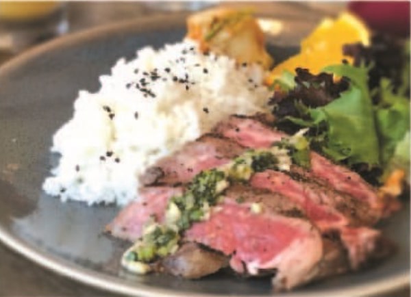 リブアイステーキは、ソテーマッシュルームと玉ねぎと好みに調理したジャガイモやライス、フォカッチャパンとミックスグリーンサラダを添えて