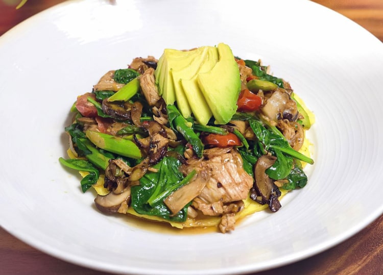 ローストチキン、アスパラガス、タマネギ、ほうれん草、赤ピーマン、マッシュルーム、トマト、チーズ、アボカドのトッピング