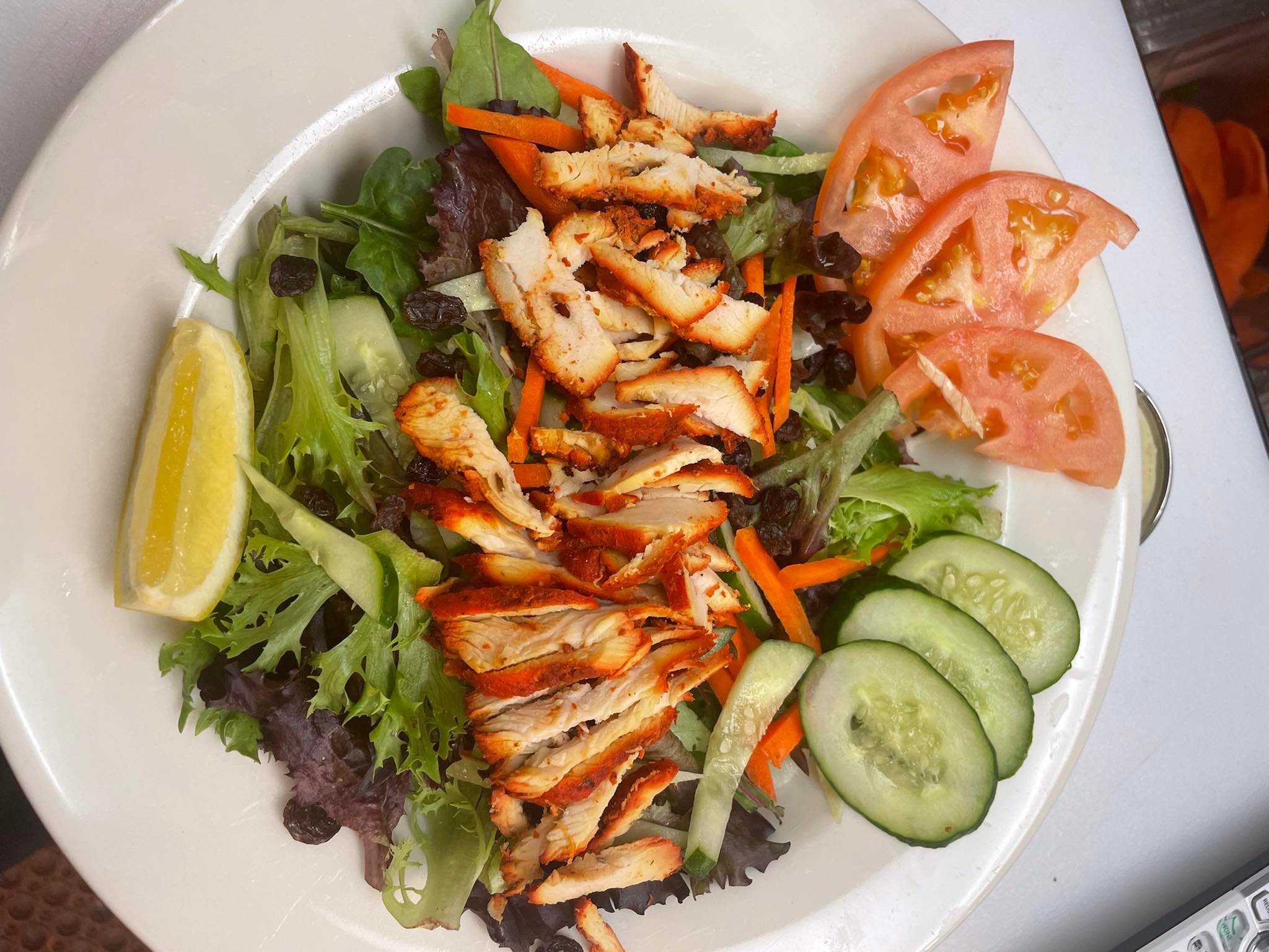 タンドリーグリルチキン、ハリヨサラダの上にのせて