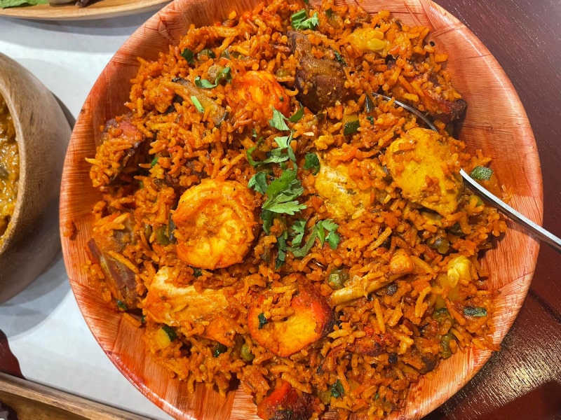 ラム、エビ、魚、鶏肉と野菜をトマトとココナッツミルクで煮込んだコンビネーション