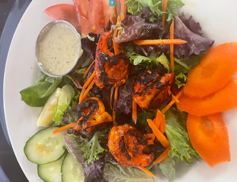 タンドリーグリルシュリンプ、ハリヨサラダの上にのせて