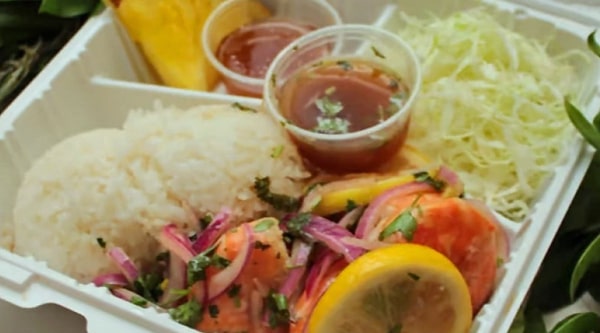 お皿には白米2スクープ、千切りキャベツ、フレッシュパイナップルスライス、そしてリリコイソースを添えて