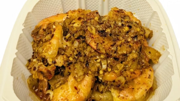 特大エビをニンニクと激辛四川マーラースパイスで炒め、バター、赤玉ねぎ、香菜と和えました