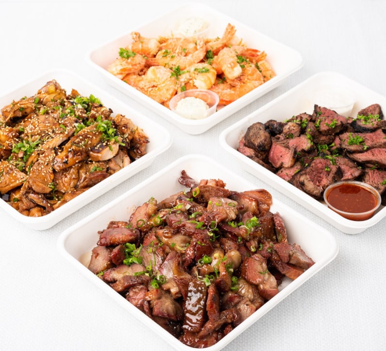 USDAトップサーロインステーキ、BBQチキン、ガーリックチキン、ガーリックシュリンプ、自家製スモークミート、自家製スモークポークキャンディベーコン
