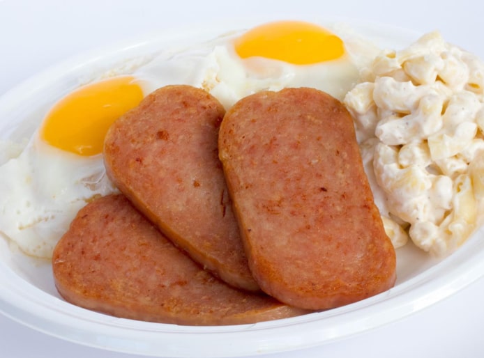 ハワイで人気のスパムを3切れ、お好みの焼き加減で卵2個と一緒にどうぞ