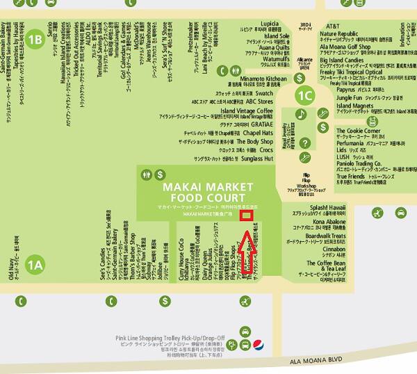 アラモアナセンターの1階でアラモアナビーチ側の左側入口から入りますと左手2件目となっています。