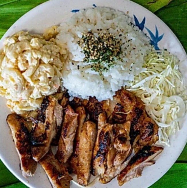 すべてのプレートにライスまたはポイ(スモールポイ+1.5ドル ラージポイ+2.5ドル)、スモールチキンロングライス、ロミサーモン、サツマイモまたはピピカウラまたはマカロニサラダ(季節限定)、ハウピアが付きます