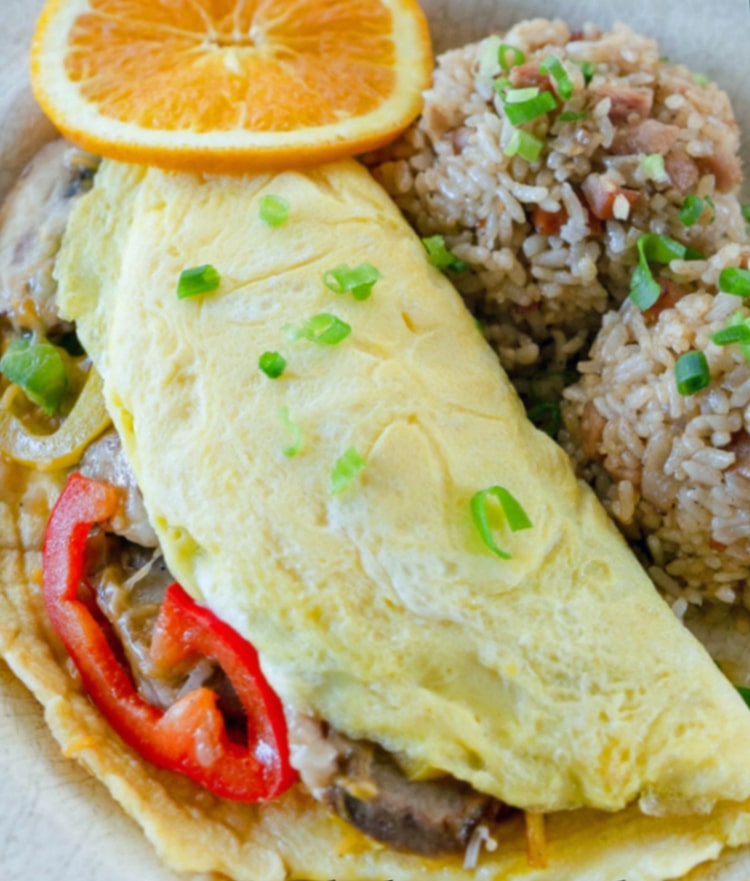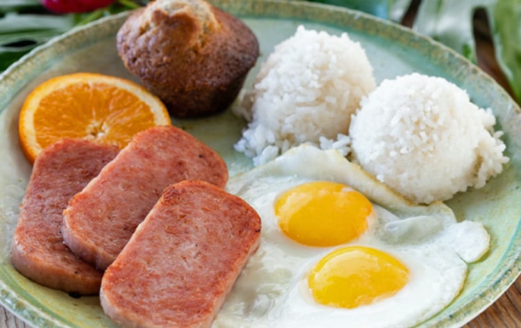 地元産の卵2個にポルトガルソーセージ、SPAM、ベーコン、ライスかトーストをお選びいただけます