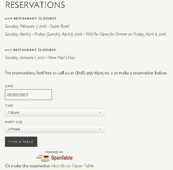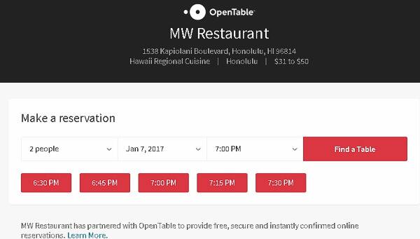 ディナー利用の予約はMWレストランのホームページから「RESERVATIONS」の部分をクリックすればオープンテーブルにて簡単にすることができます。