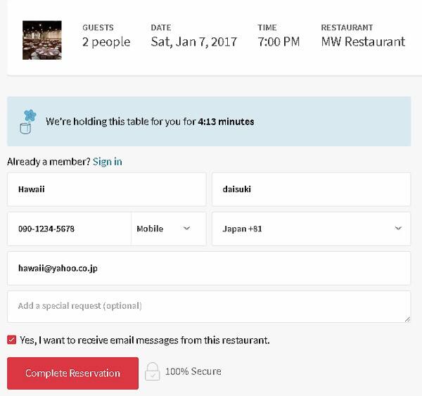 予約完了のメールが欲しい方はYes, I want to receive email messages from this resutaurant.の前の所にチェックを入れておくことを忘れないようにしましょう。