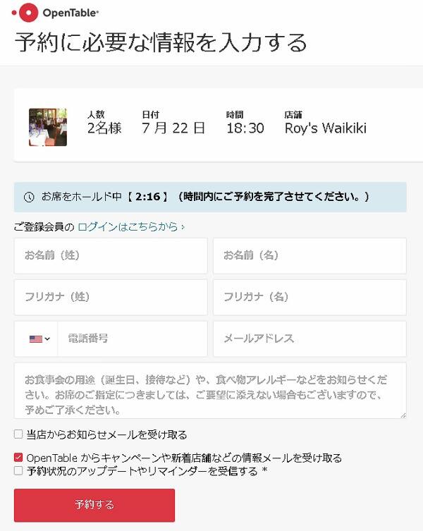 全て入力したら予約するという部分をクリックすれば完了となります。
