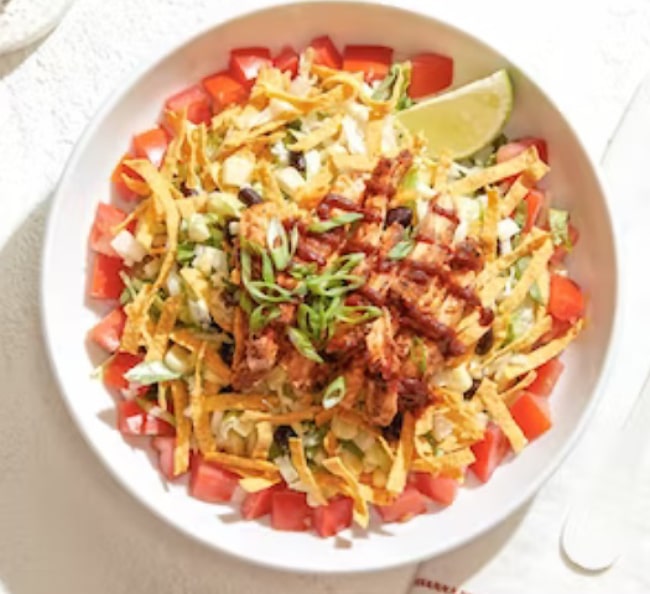 黒豆、スイートコーン、ヒカマ、新鮮なコリアンダー、バジル、クリスピーコーントルティーヤストリップ、モントレージャック、そして私たちのハーブランチ