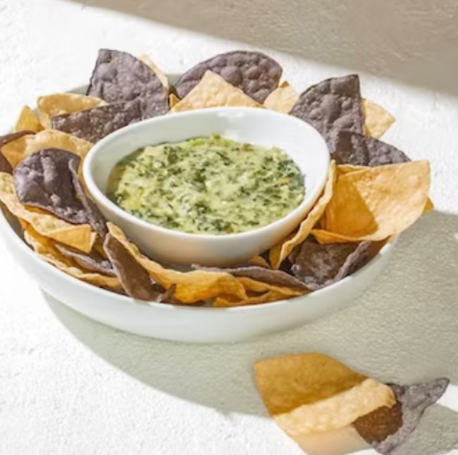 自家製ブルー&ホワイトコーントルティーヤチップスを添えて温かいままお召し上がりください