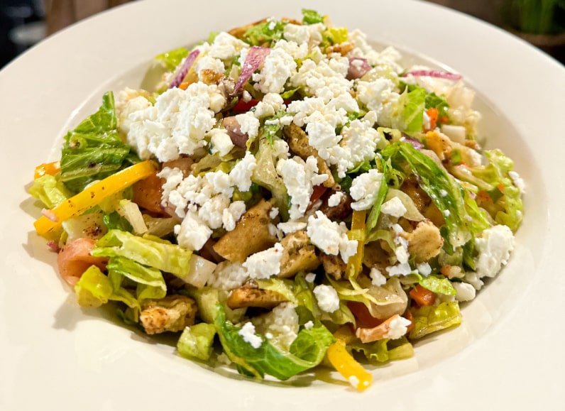 刻んだロメインレタス、トマト、タマネギ、キュウリ、ラディッシュ、パプリカ、フラットブレッド・クルトン、ザクロ糖蜜ドレッシング