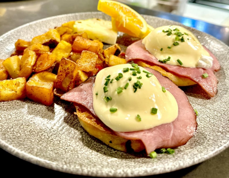 トーストしたイングリッシュマフィンにポーチド・ワイアルアエッグ2個、オランデーズソース、カントリースタイルのポテト、フルーツ添え