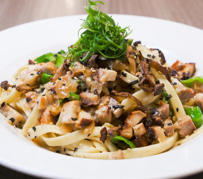 豚バラ肉のマリネ、柚子出汁のカルボナーラソース、ししとう、キャラメリゼした玉ねぎ、ローストしたしめじ、フェットチーネ、ふりかけ、青ねぎ