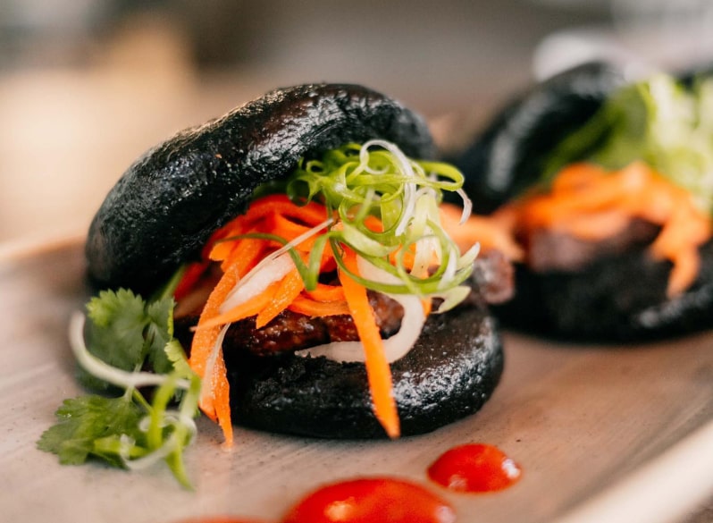 炭火肉まん、野菜のピクルス、ホイジン・シラチャ・ソース