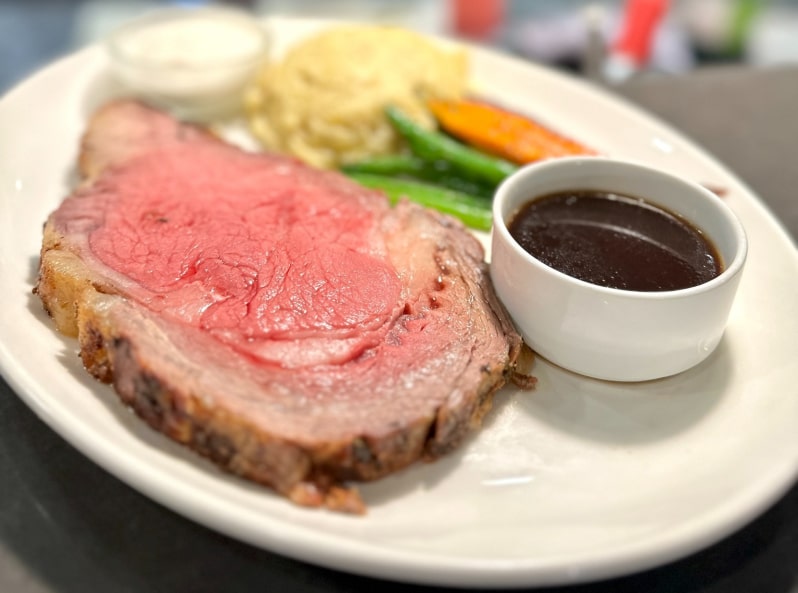 10ozのハワイアンソルト&ハーブのプライムリブ、ガーリックマッシュポテト、野菜メドレー、ホースラディッシュのクリーム煮、オーソース