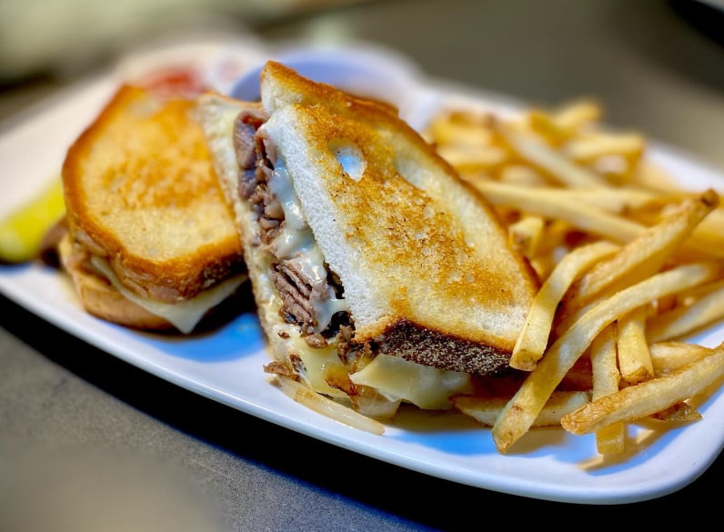グリルしたサワードウ、スイスチーズ、キャラメルオニオン、ホースラディッシュクリーム、オーソース、フライドポテト