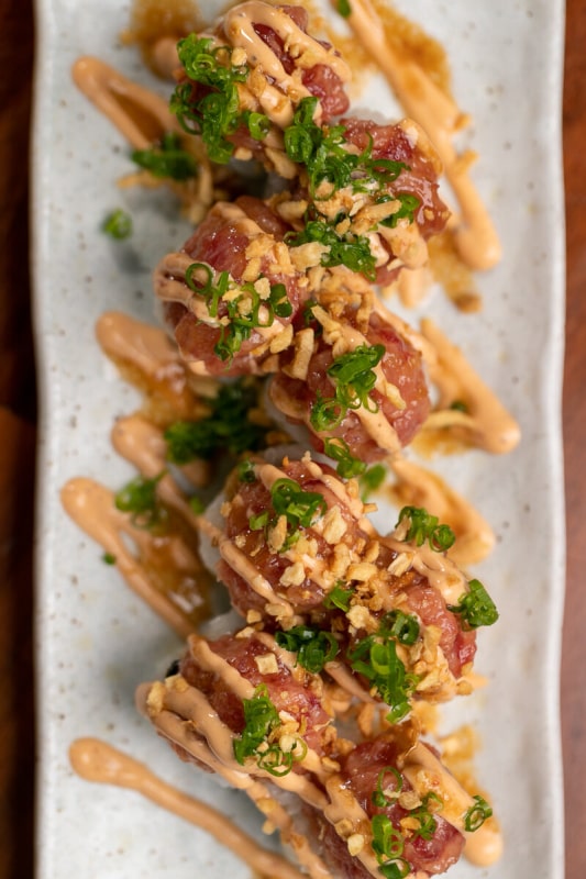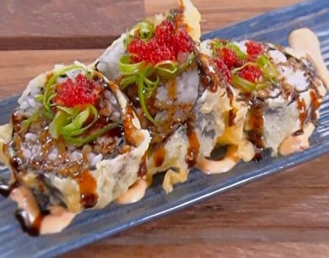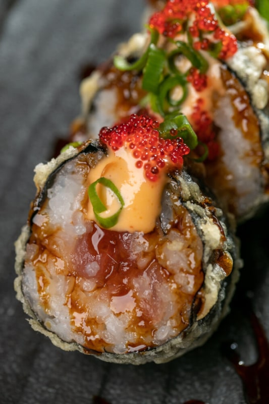 クリスピースパイシーアヒマキはピリ辛なマグロの巻き寿司を天ぷらで揚げて、蒲焼きソースとアイオリソースをかけたものです。