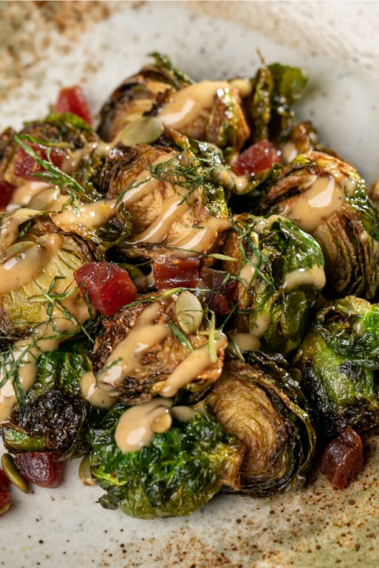 クリスピー芽キャベツは素揚げした芽キャベツに中華ソーセージや南瓜の種が和えられていて、ボリュームもあっておつまみには最適です。