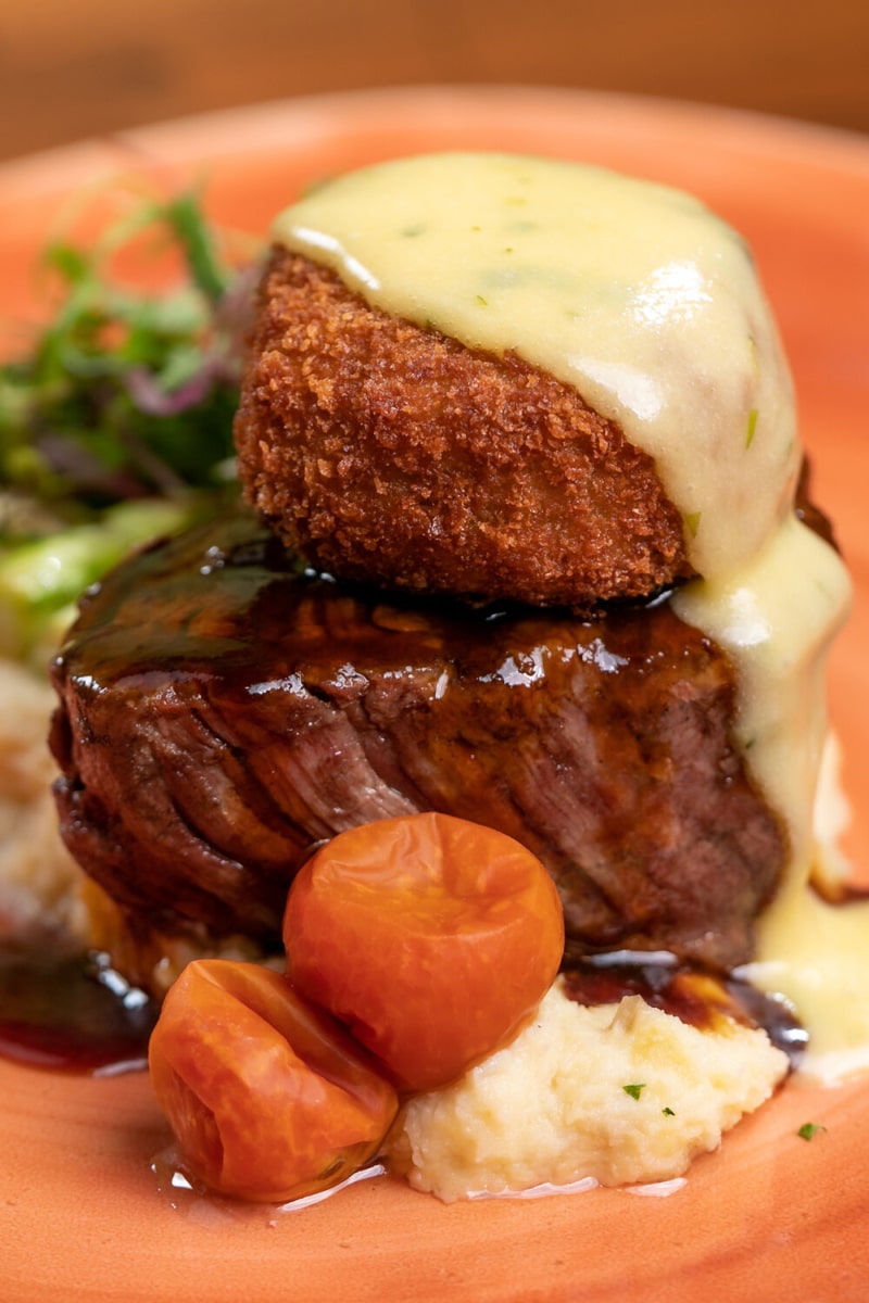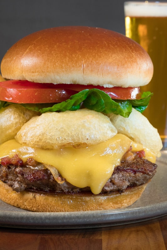 猪肉&マカヴェリ牧場産ビーフ、ベーコンジャム、キャラメリーズドオニオン、チポトレアイオリ