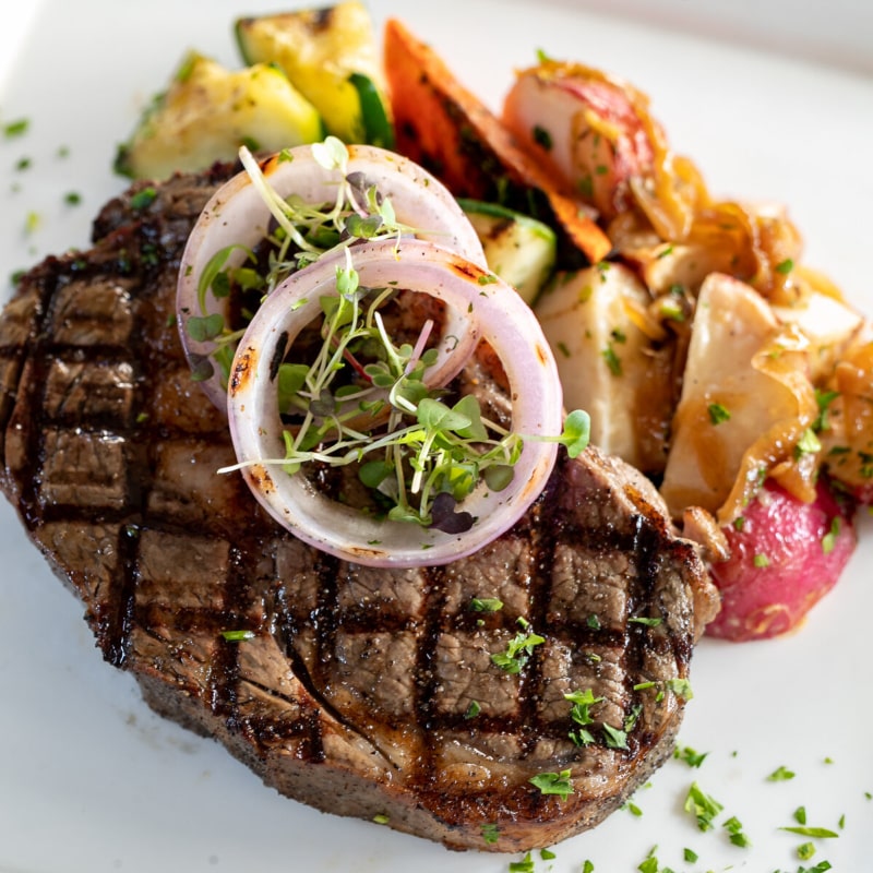 チミチョリソース、ユーコンゴールドマッシュドポテト、グリルドベジタブルメドレー