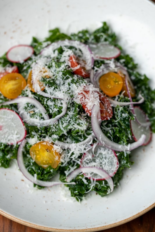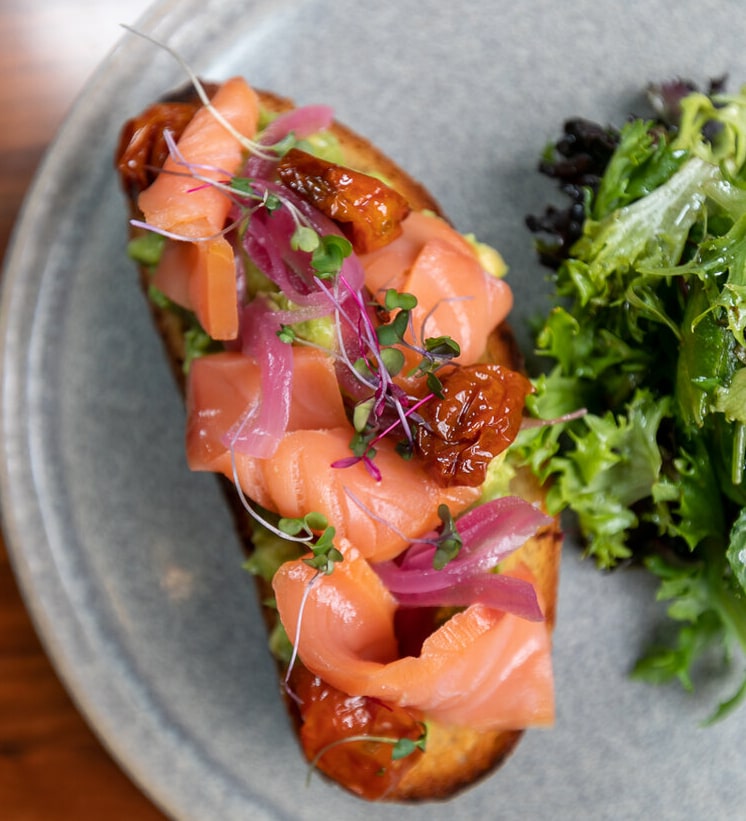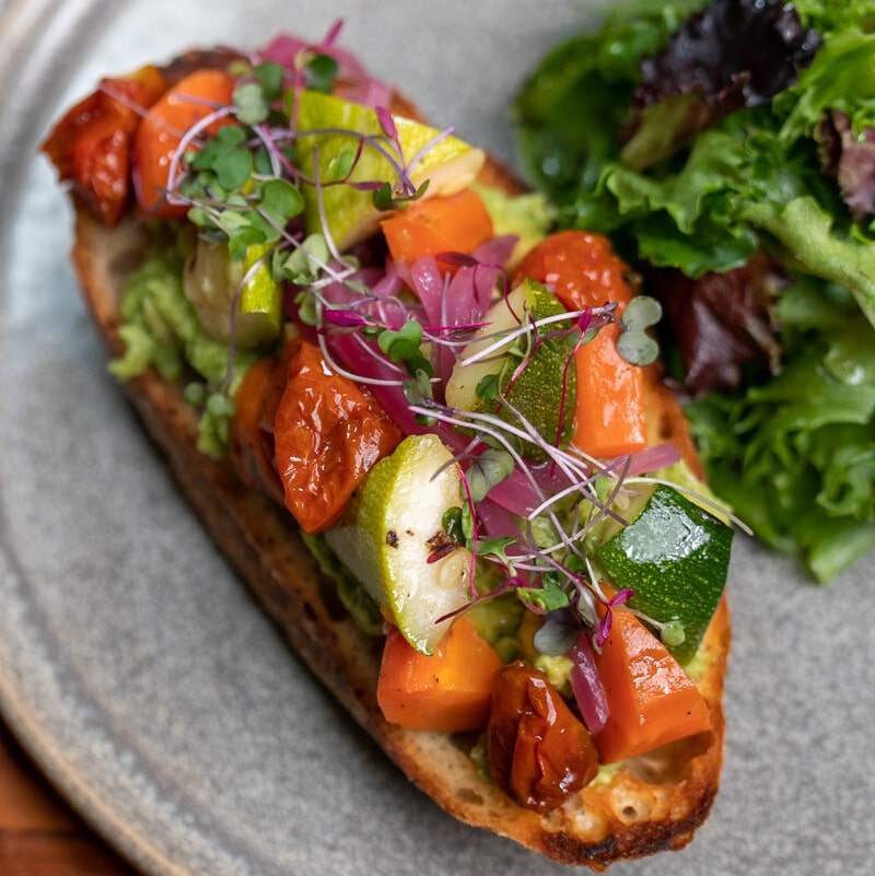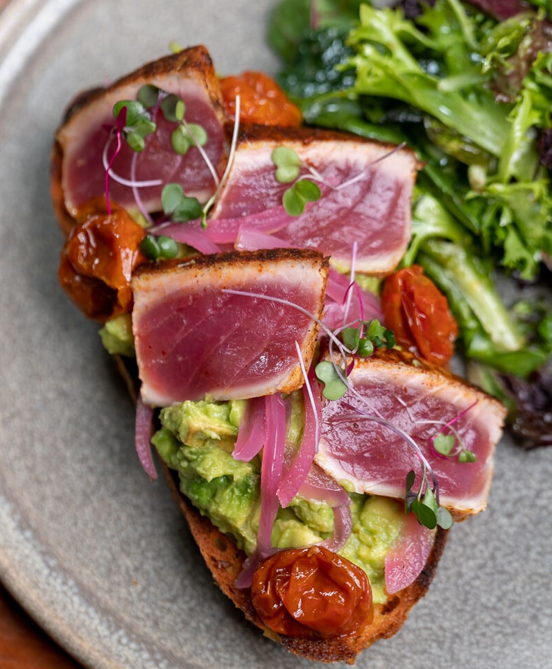 アボカド、24時間ローストトマト、ピクルスオニオン