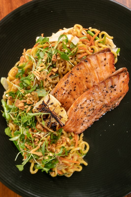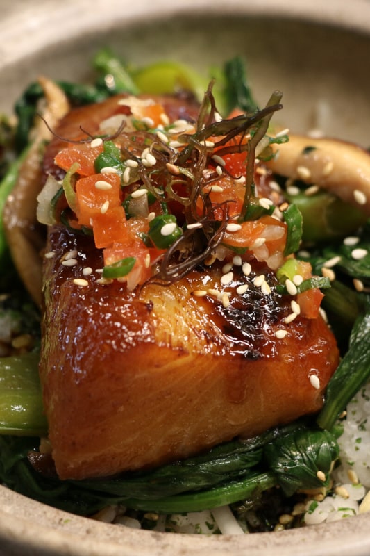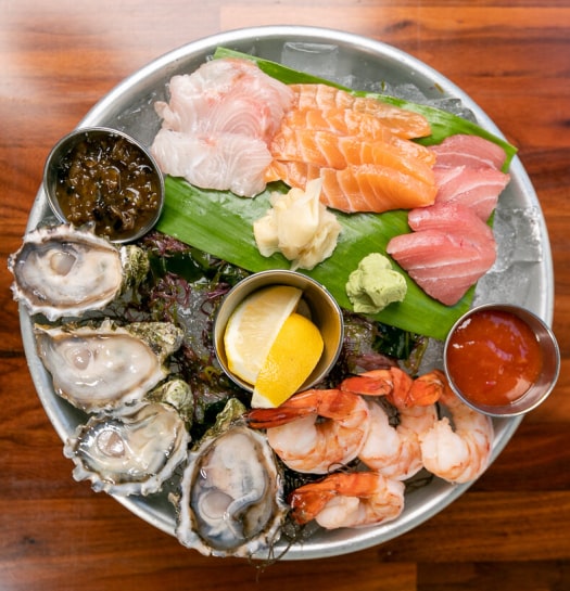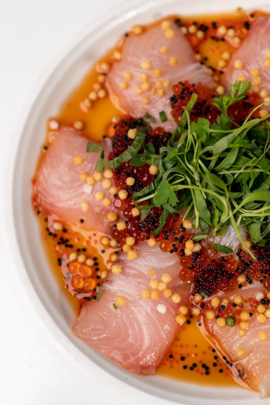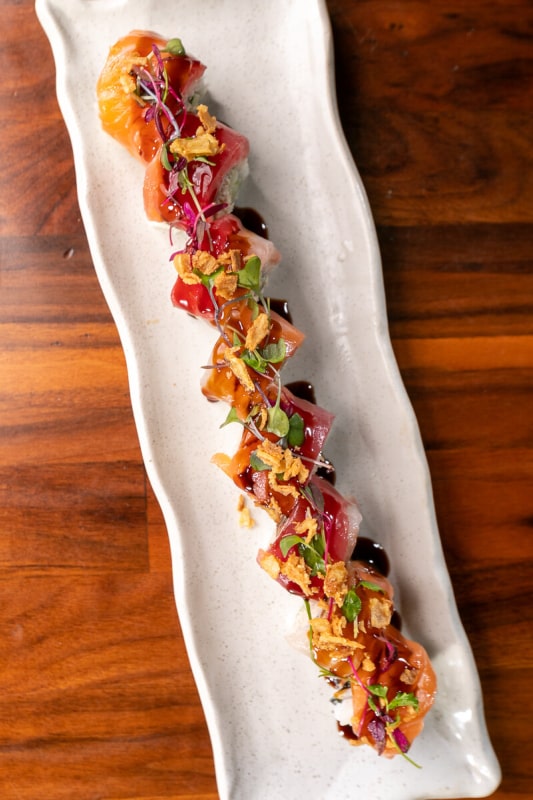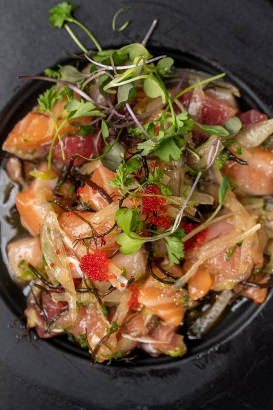 アヒ、コナカンパチ、サーモン、オゴ、ガーリック醤油