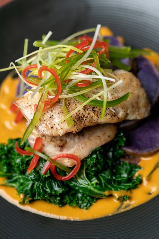 レッドタイカレー、ローストスイートポテト、ケールのソテー