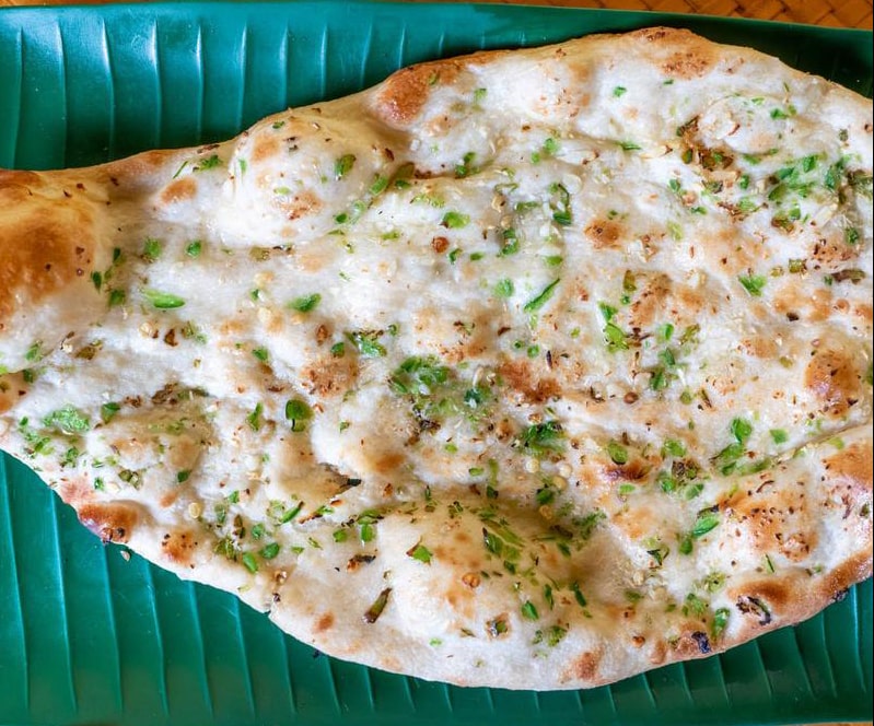 ナンにニンニクとコリアンダーのみじん切りをまぶしてタンドリーオーブンで焼いたもの