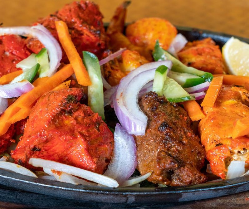タンドリーオーブンで炭火焼きにしたチキンティッカ、ラムセクワフィッシュ、シュリンプのコンビネーションプレート