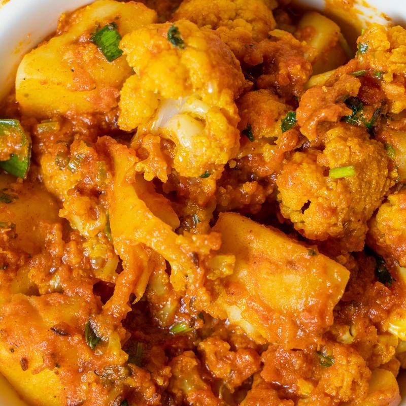 タマネギ、トマトをベースにお好みの野菜とジャガイモを伝統的なスパイスで煮込みます