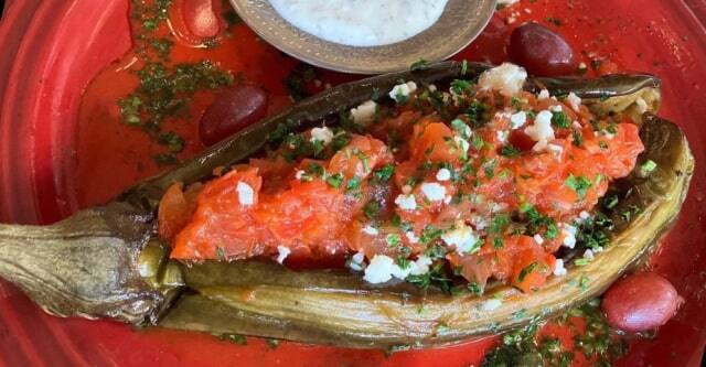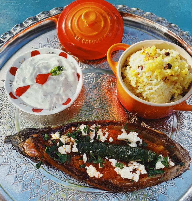 ワイマナロ茄子、ホーファームトマト、サフランピラフ、生クリームのザジキ(ヴィーガン用にフェタとザジキ抜きをリクエストしてください。)