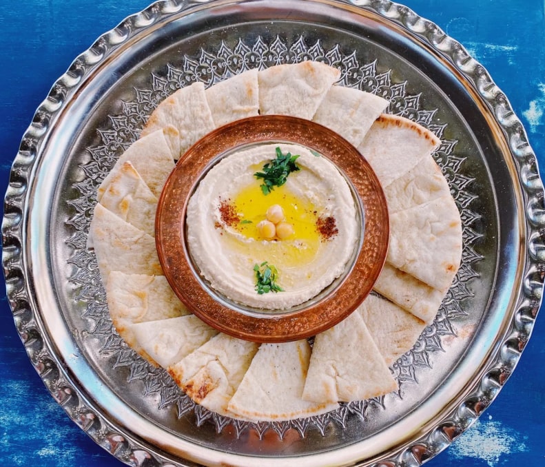 手造りされた前菜で、3種のおすすめのペーストをフムスとピタパンで楽しむことができます。
