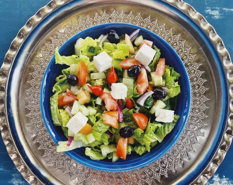 トマト、キュウリ、レタス、硬化オリーブ、フェタチーズとハルーミの雪、上質なハーブ入りホワイトバルサミコビネグレット