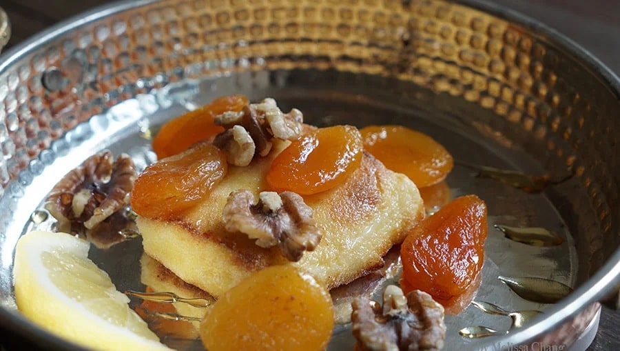 キプロスの珍味ハルーミ、マルメロ、クルミ、ハワイの蜂蜜、ピタ